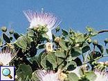 Überall im Hinterland wachsen auf Malta Kapernsträucher, die hübsche, feingliedrige Blüten haben. Rechts im Bild sieht man ferner einige Knospen. Die Einheimischen sammeln sie und legen sie ein. In einer Marinade werden die Knospen mit der Zeit zu den berühmten Gewürzkapern, wie man sie in vielen maltesischen Gerichten findet. Zwischen 60 und 150 cm hoch werden die Strächer, deren eiförmigen bis kreisrunden Blätter unverwechselbar sind. (Tal Qarbuni, Juni 2001)