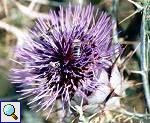 Allenthalben findet man entlang der Wege oder auf verwilderten Feldern kleine, distelähnliche Pflanzen mit violetten Blüten. Es handelt sich dabei um Kardonien, die Wildform der vom Menschen kultivierten Artischocke. Vor allem bei den Insekten ist diese Pflanzenart wegen ihres Nektars überaus beliebt, aber auch Eidechsen turnen zuweilen an ihnen herum, um an den süßen Saft zu gelangen. Kardonien lieben warme Böden und werden bis zu 1,5 m groß. (Tal Qarbuni, Juni 2001)