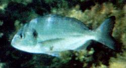 Diese Fischart sah ich stets in kleinen Gruppen durch die Blaue Lagune vor Cominotto schwimmen, siehe Foto ganz oben rechts. Goldbrassen sind recht scheü Wesen, sodass man sich in ihrer Nähe nach Möglichkeit langsam bewegen sollte, um sie in Ruhe betrachten zu können. Das auf dem Foto neben diesen Zeilen abgebildete Tier war zwischen 15 und 20 cm lang. Im Mittelmeerraum erfreuen sich Goldbrassen als Speisefisch größter Beliebtheit - vermutlich sehr zum Leidwesen der Tiere. (Blaue Lagune vor Cominotto)